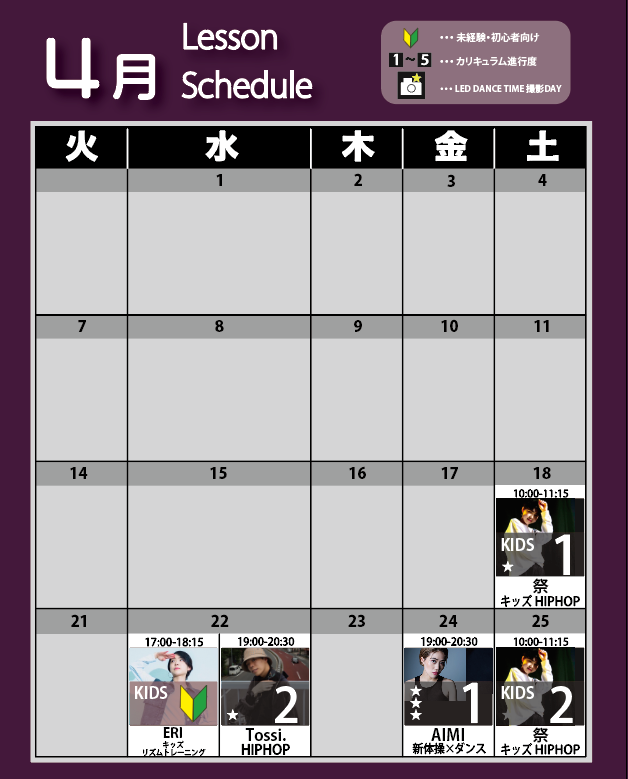 ★レッスン開講週が異なる曜日がございます。ご確認の上、お間違えのないようご予約ください。
